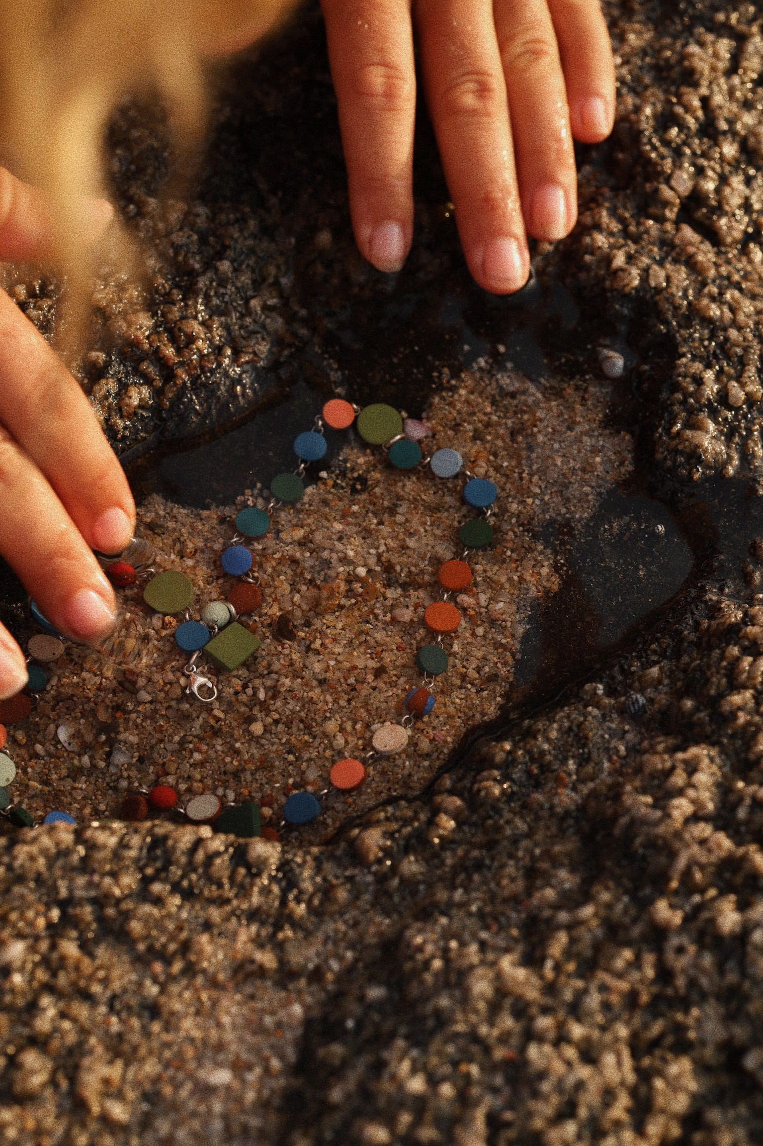 The Low Tide Rosary has 3 adjustments: 14, 16, or 20 in. This adjustable design features a back adornment. The shorter you wear it in the front the longer it is in the back. The back adornment acts as a counter weight and looks beautiful with a backless top or bikini. Form + Function.