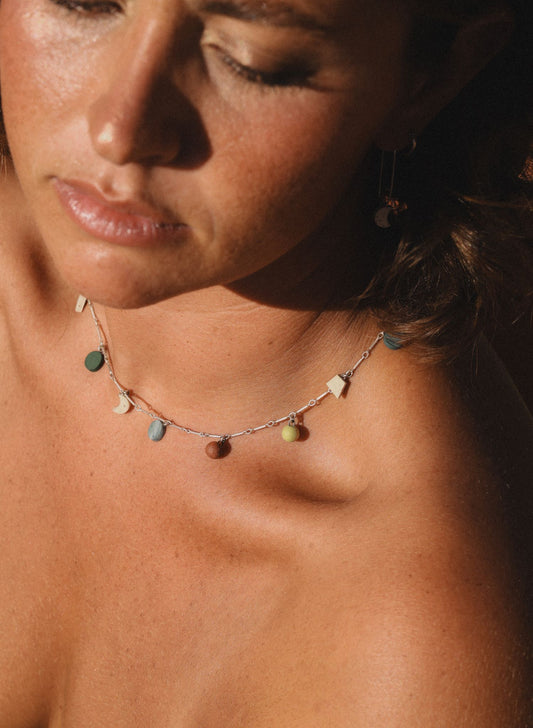 Many of our necklaces are adjustable with a back adornment. The shorter you wear the necklace in the front, the longer it is in the back. The back adornment acts as a counter weight and looks beautiful with a backless top or bikini. Form + Function.