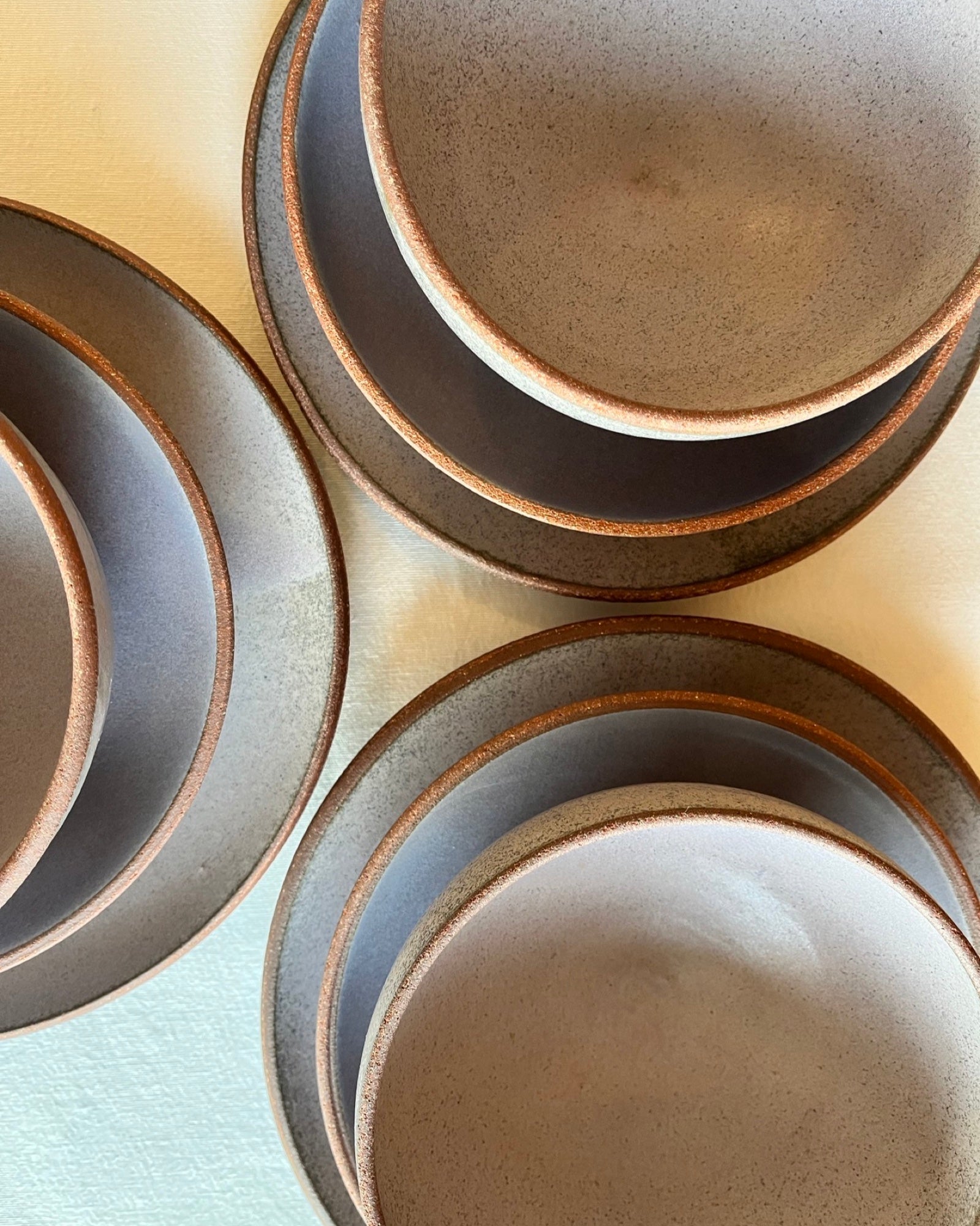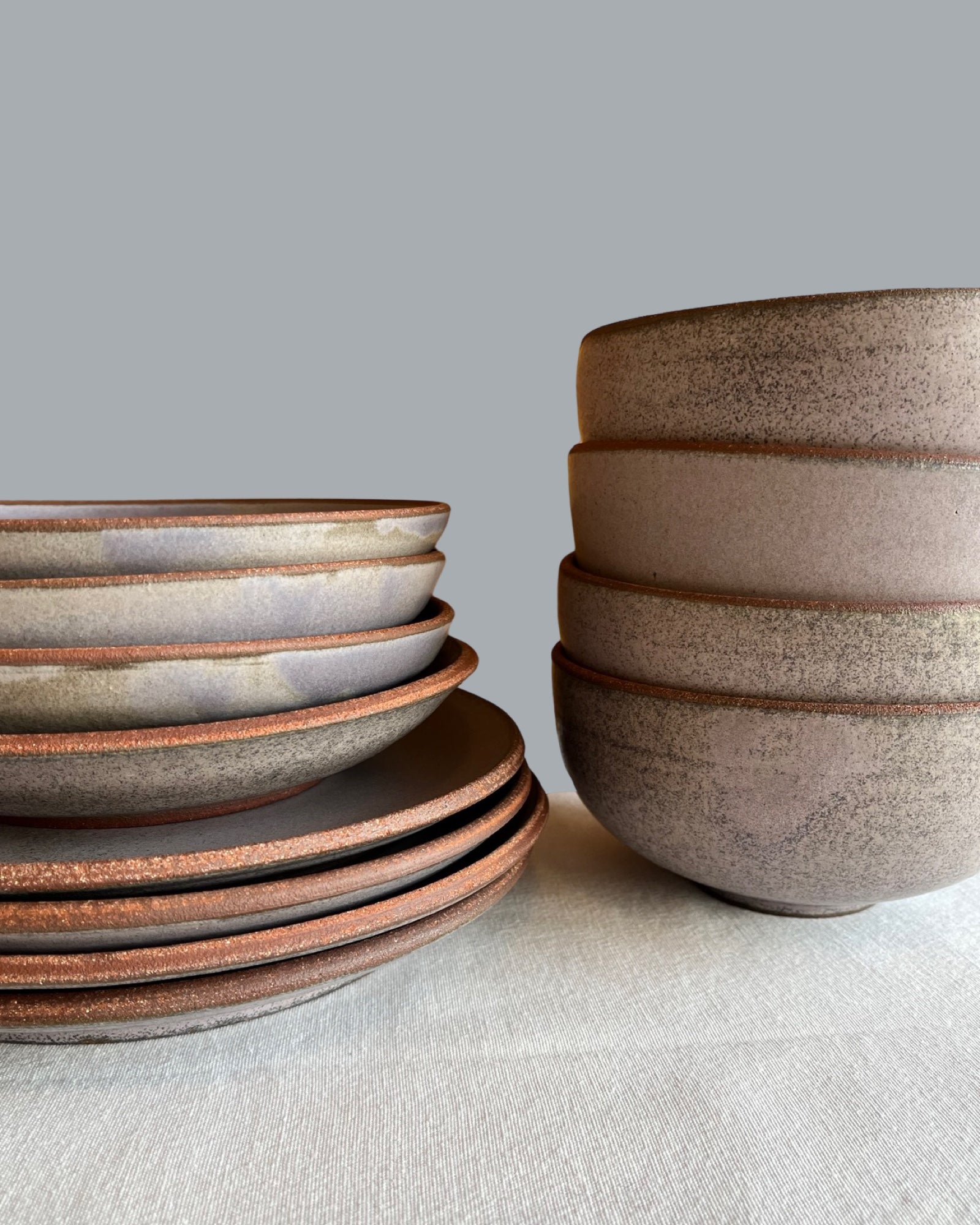 Wheel thrown, stackable dish sets. Exposed edge, sanded smooth. Dishwasher and microwave safe. Sets are sold by the placement: 1 Dinner Plate, 1 Salad Plate, and 1 bowl. Tumblers and mugs sold separately.