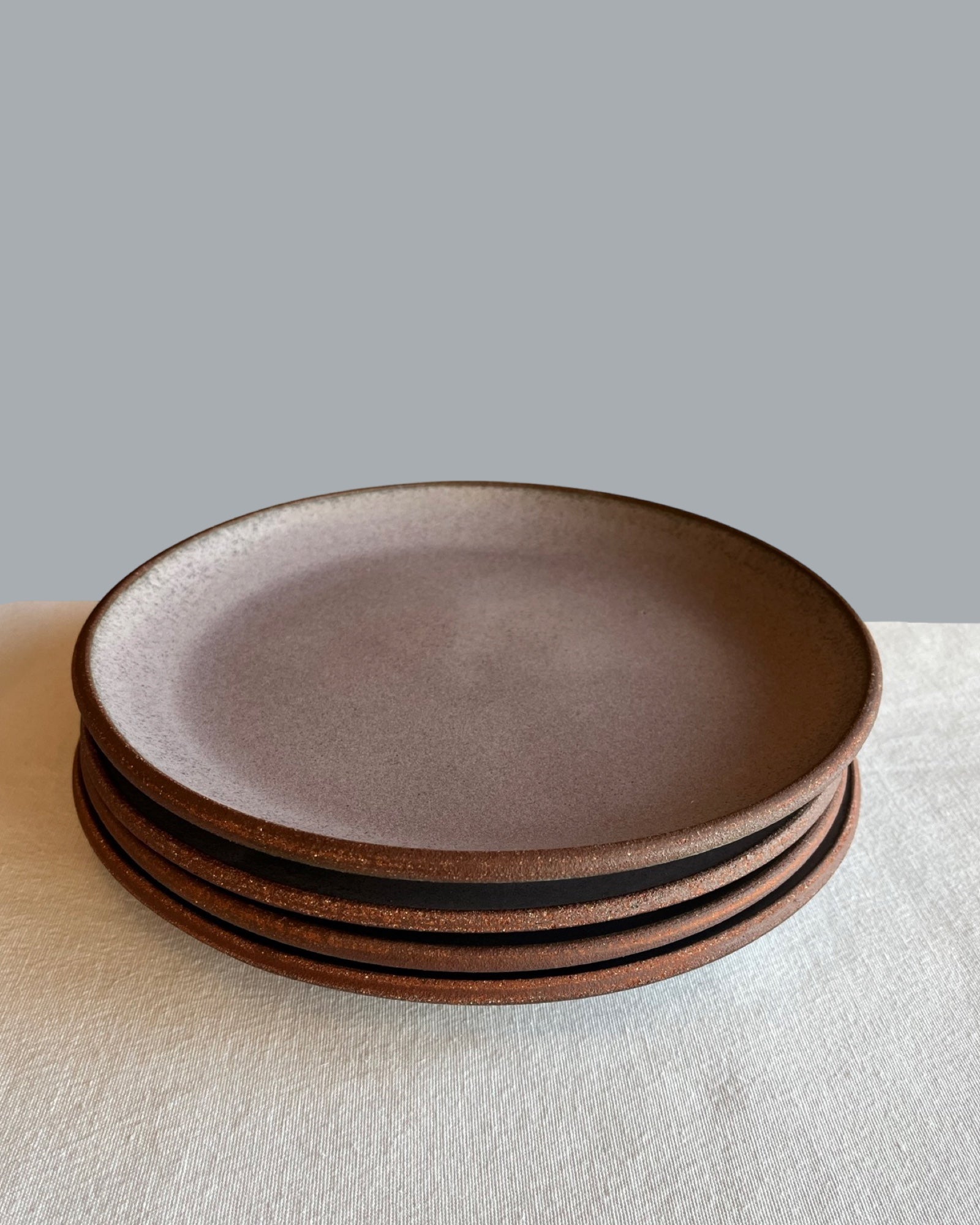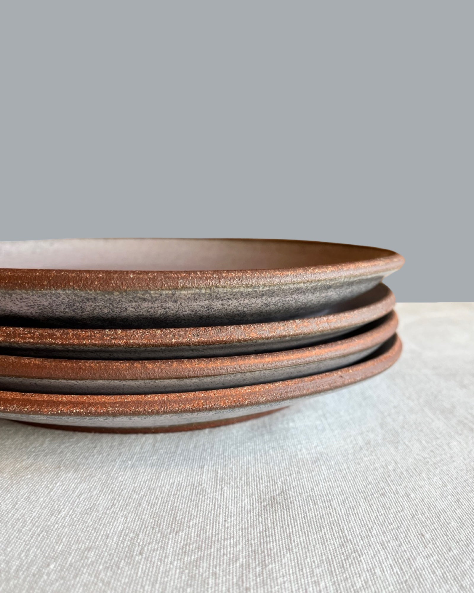 Wheel thrown, stackable dinner plates with trimmed foot. Exposed edge, sanded smooth. Dishwasher and microwave safe.