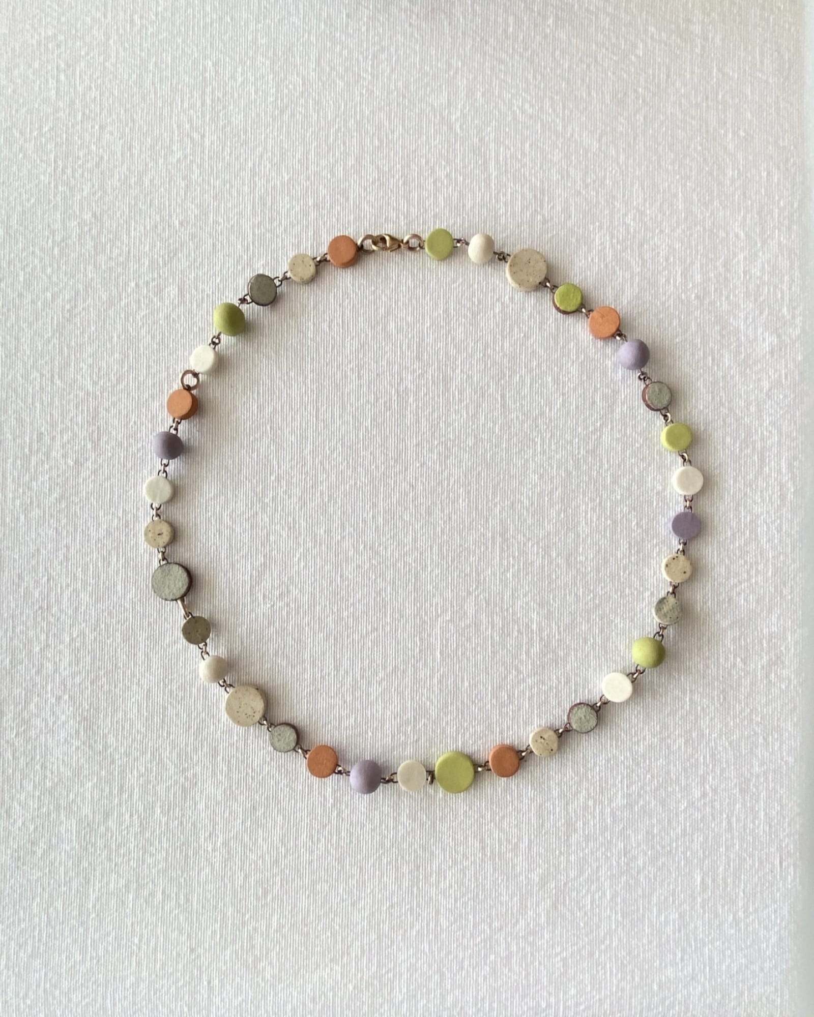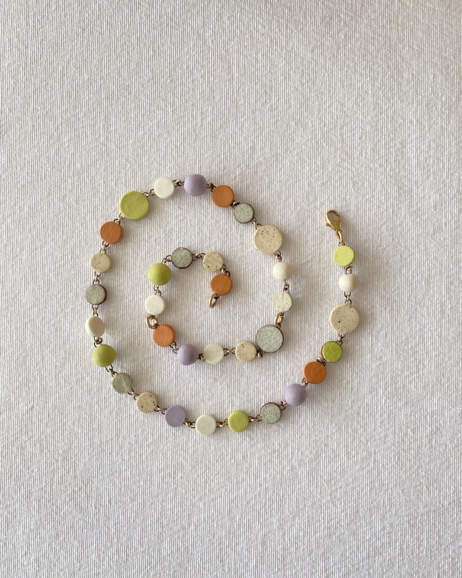 Sea Lavender is composed of the following clay bodies: stained porcelain in chartreuse and lavender, hand-painted red earthenware with an exposed edge, marbled darkleaf porcelain with speckled stoneware, and a simple terra cotta.