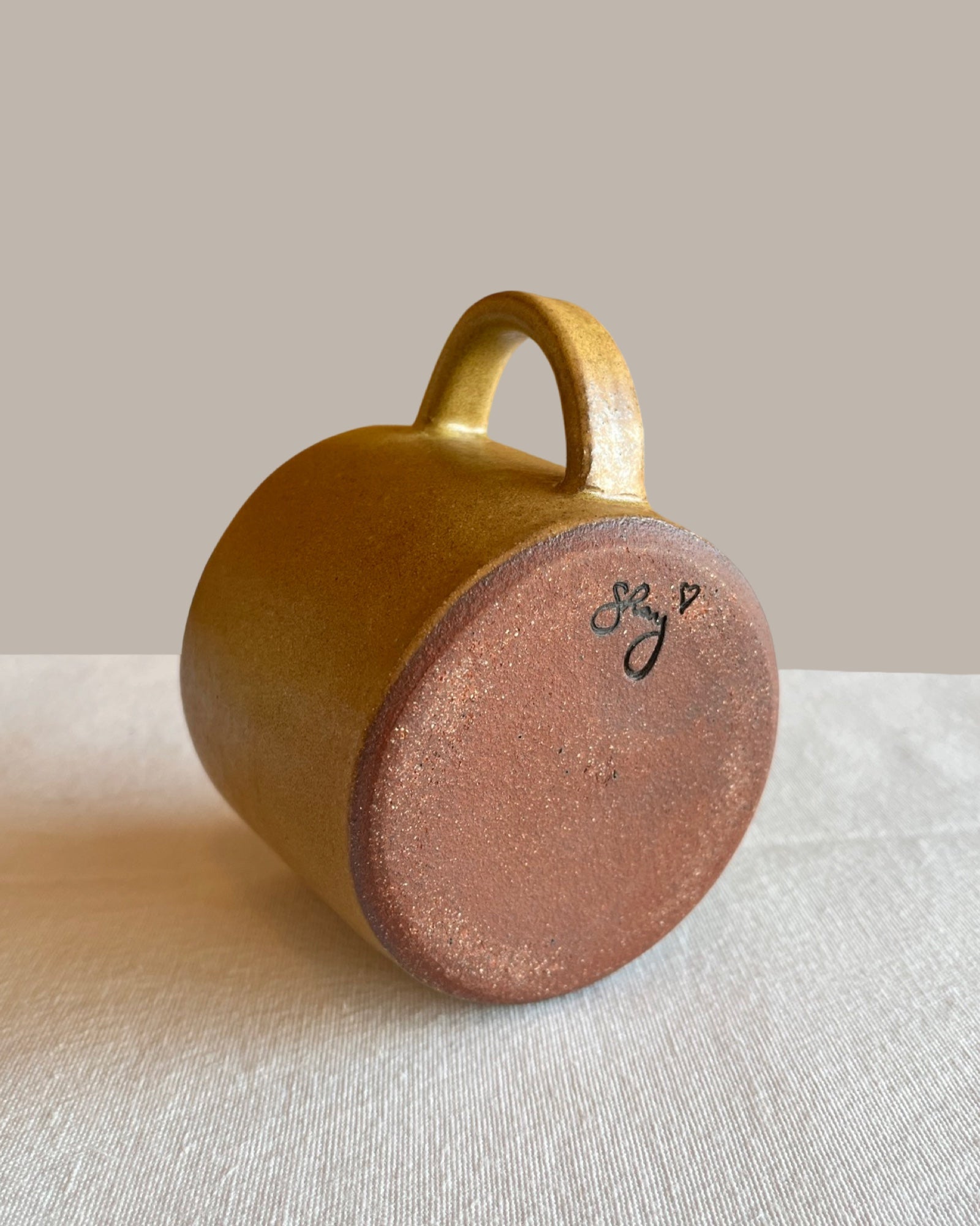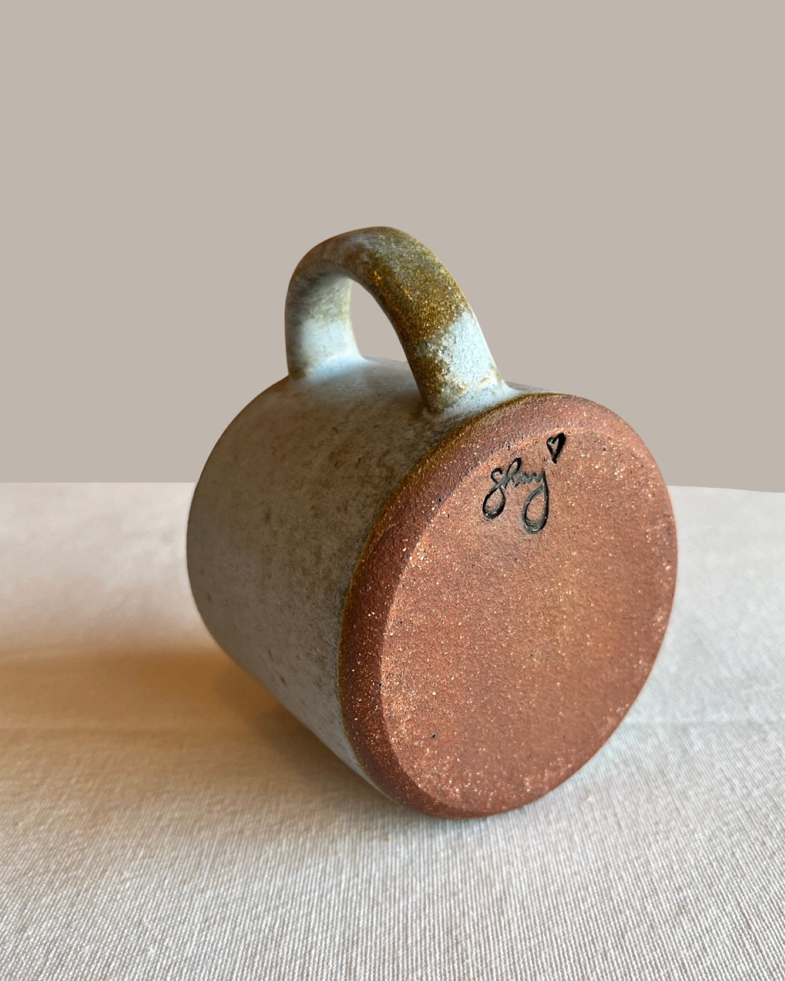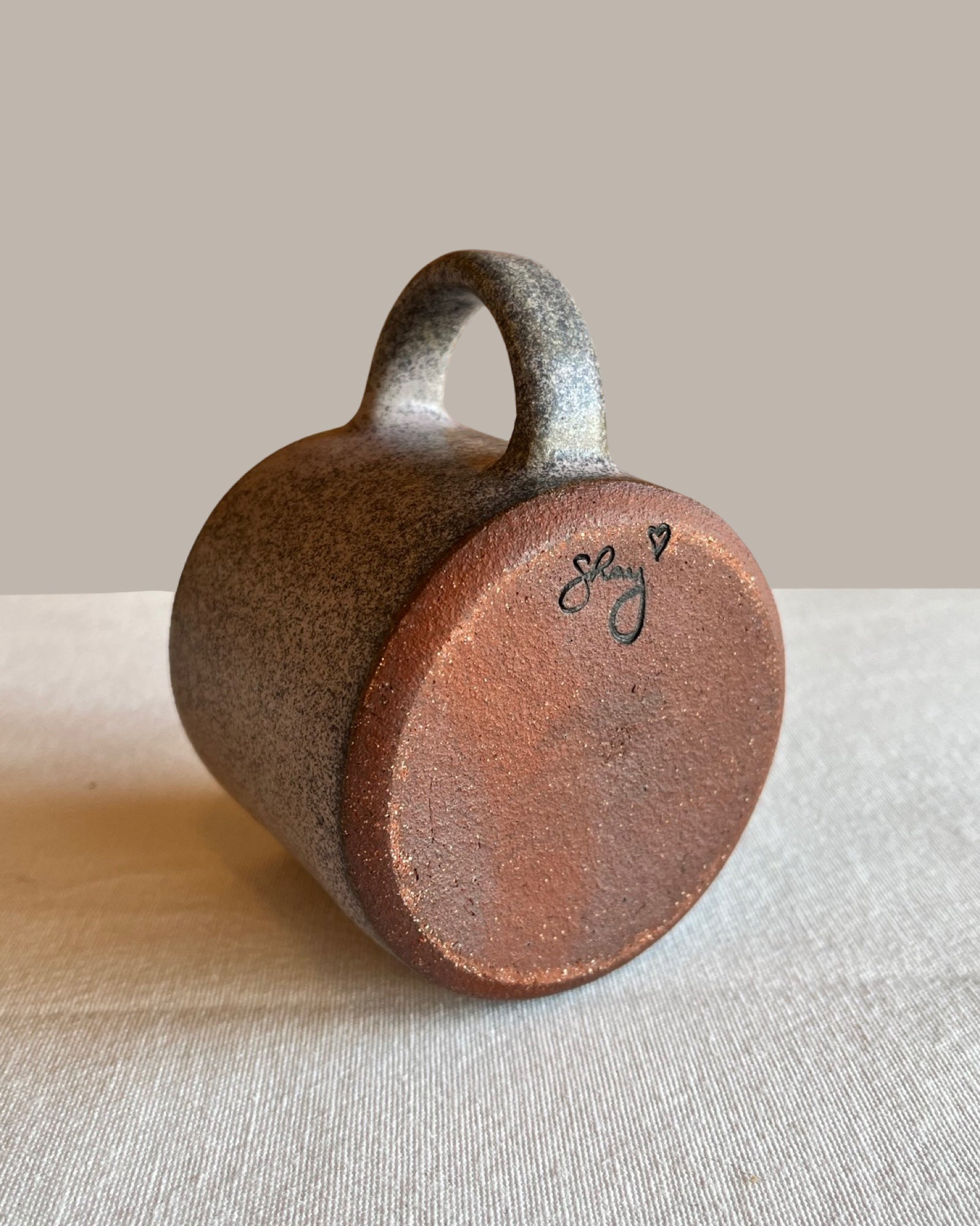Wheel thrown. Exposed edge, sanded smooth. Dishwasher and microwave safe.