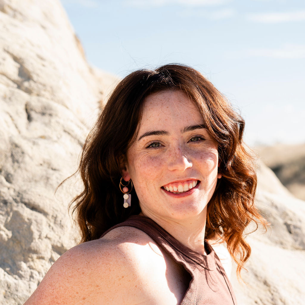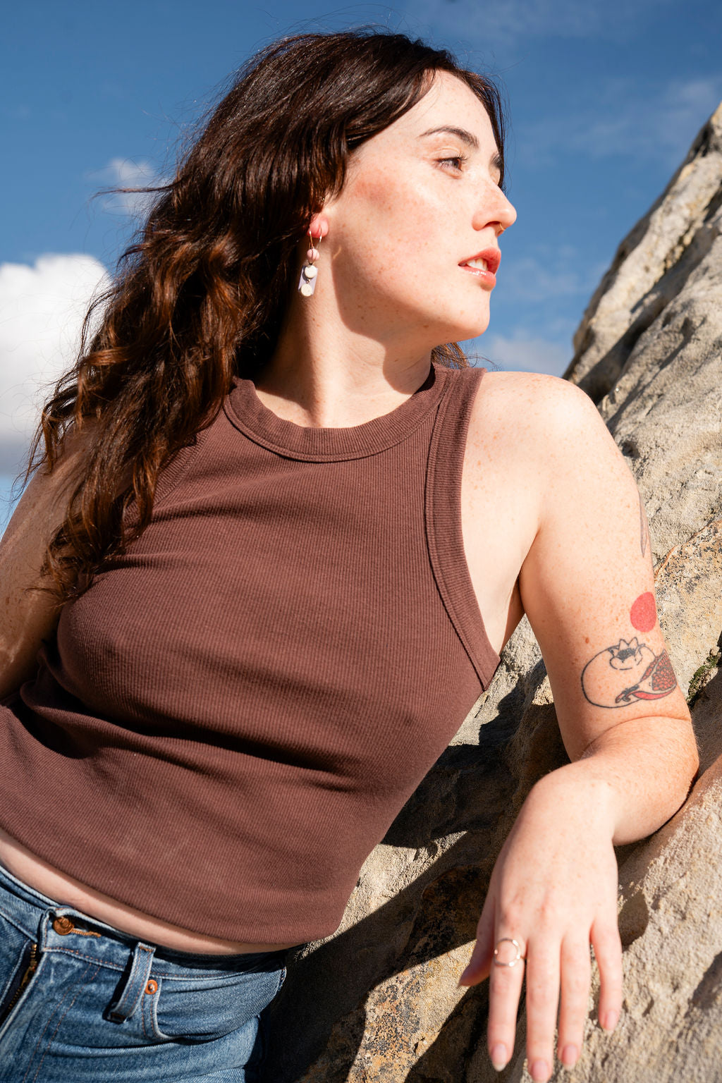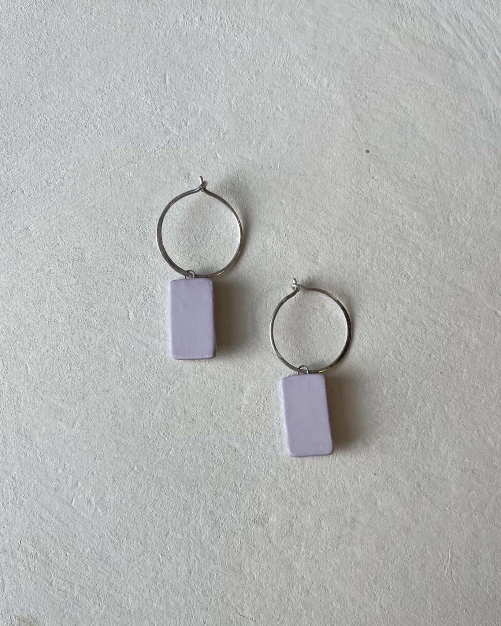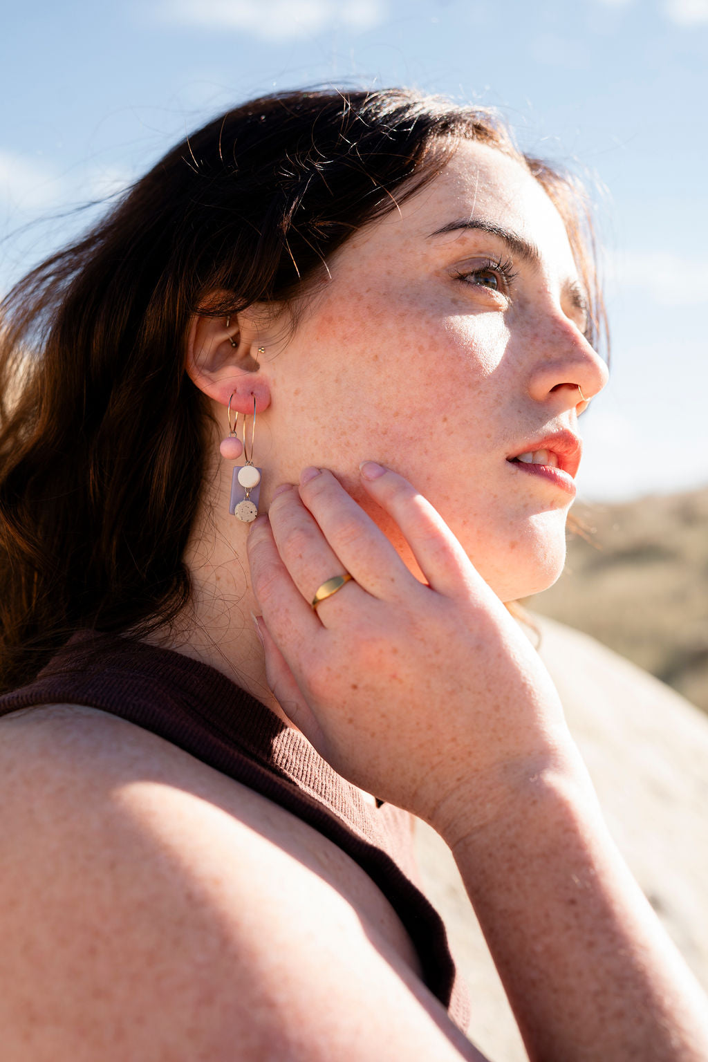 This look: Susannah is wearing Lavender Rectangles, stacked with double Stellas. In her seconds she is wearing mini hoops with Blush Dotties. Charmed Hoops are interchangeable. Loose charms can be purchased and added to your hoops here.