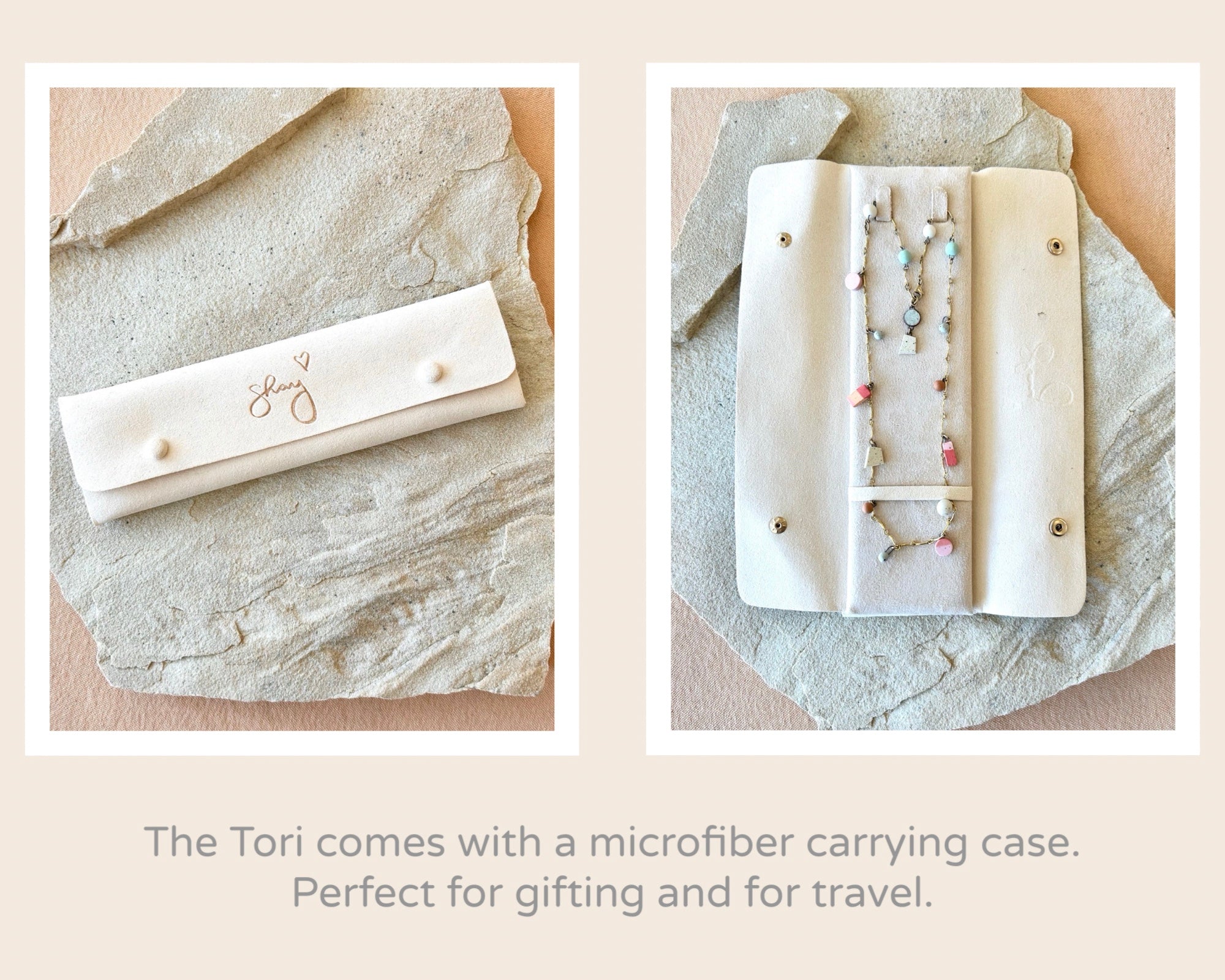 Form + Function. Every Tori necklace has a back adornment located next to the clasp. This feature acts as a counter weight keeping the clasp in the back. The longer your necklace length, the longer the back adornment. This feature looks lovely with hair up or with a backless top. It also serves a function, making it easier to locate the clasp when taking it off.