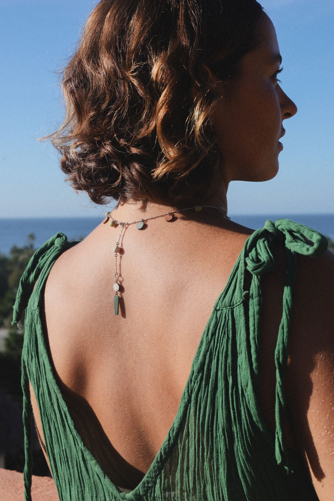 Form + Function. Every Tori necklace has a back adornment located next to the clasp. This feature acts as a counter weight keeping the clasp in the back. The longer your necklace length, the longer the back adornment. This feature looks lovely with hair up or with a backless top. It also serves a function, making it easier to locate the clasp when taking it off.