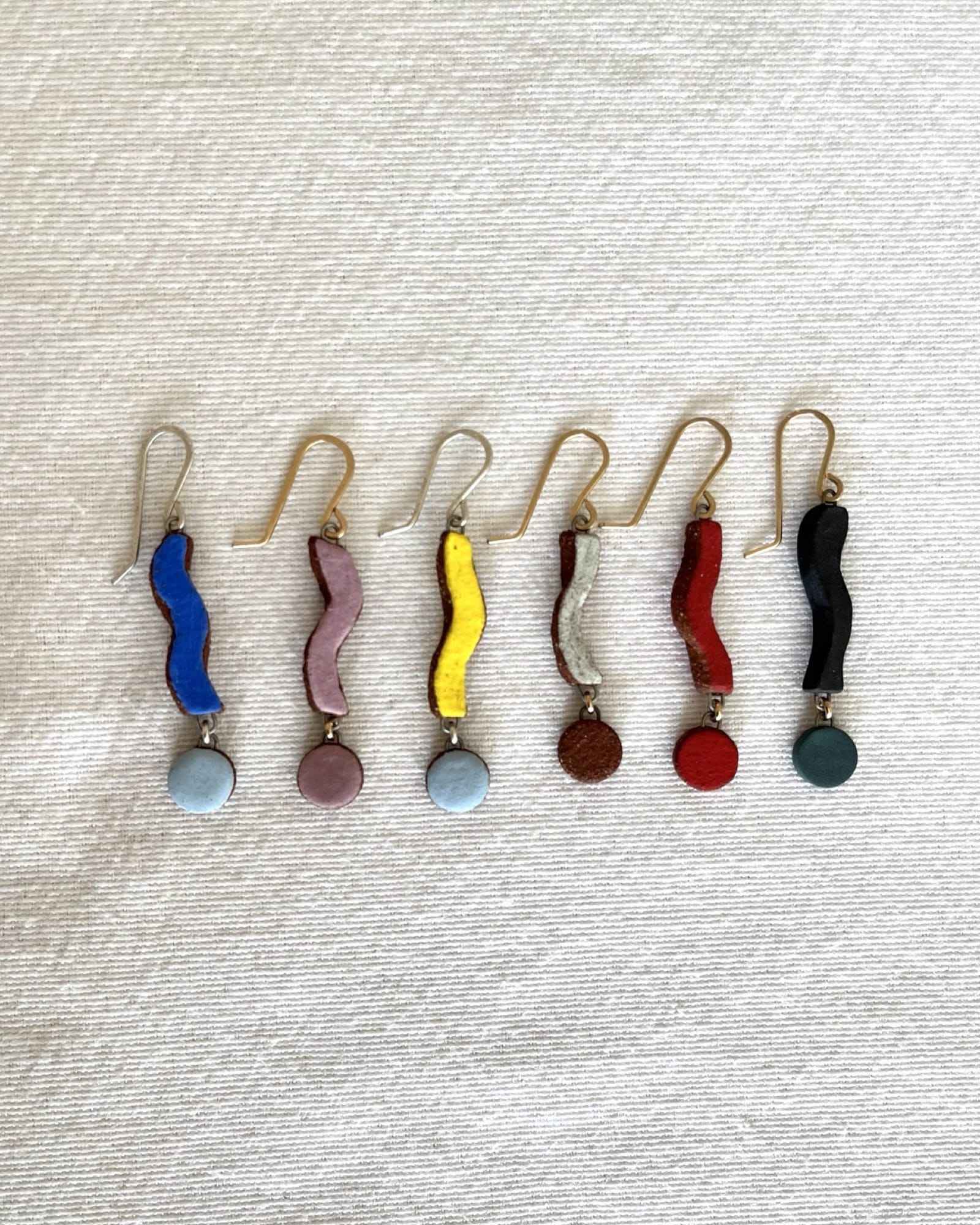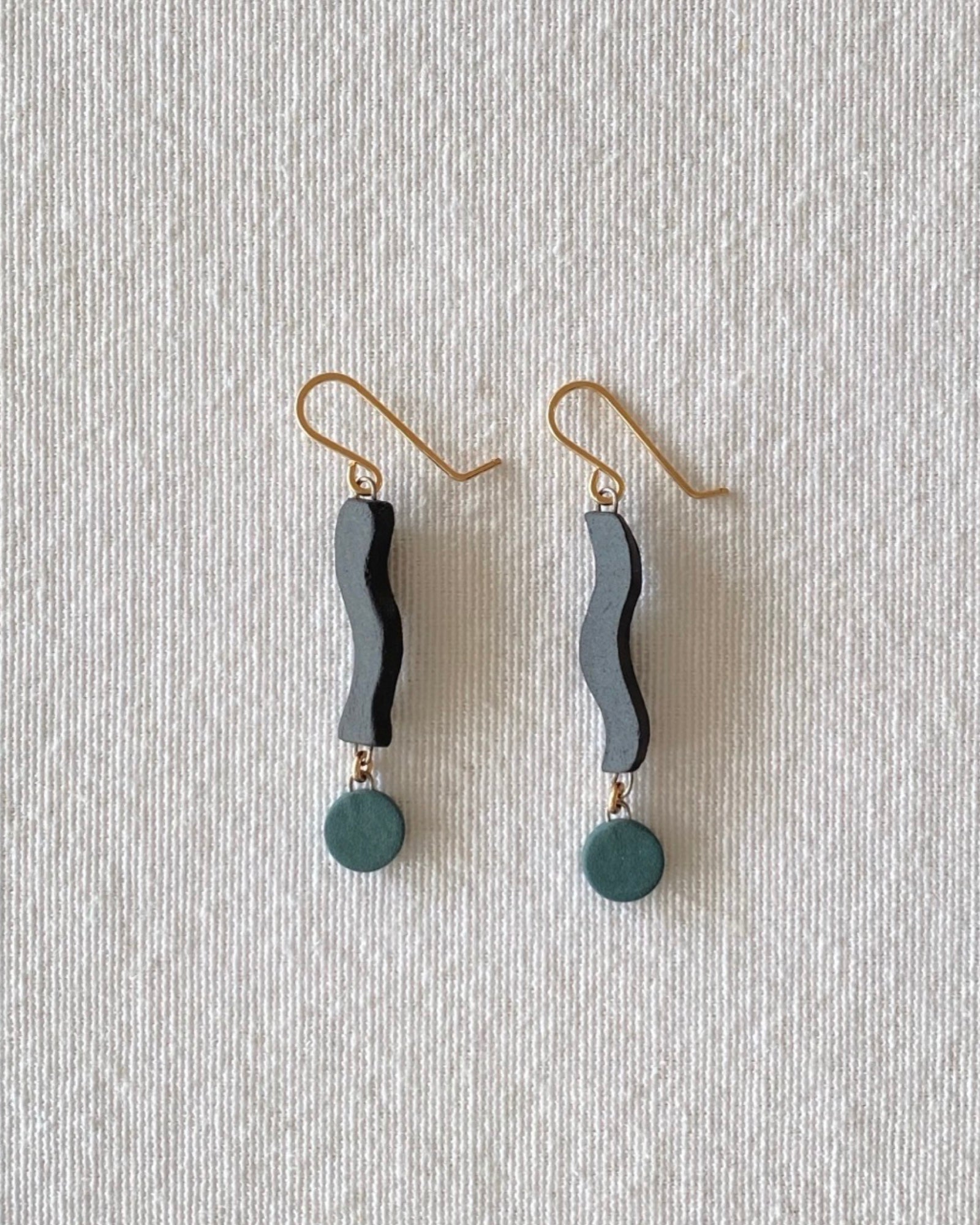 Handmade ceramic earrings. Drawn and cut from a slab of black earthenware and stained porcelain.